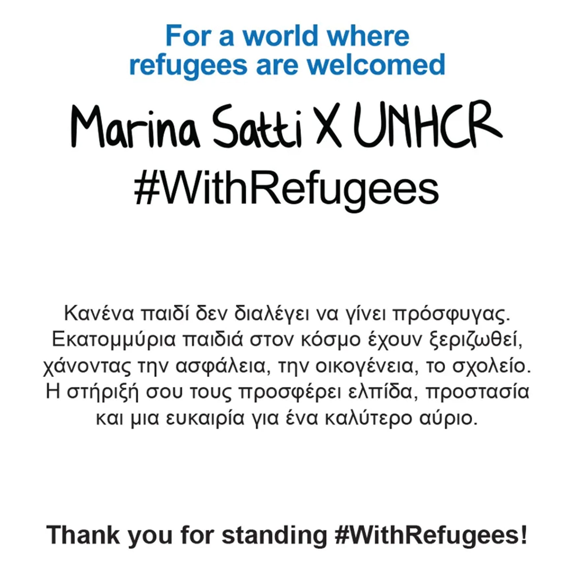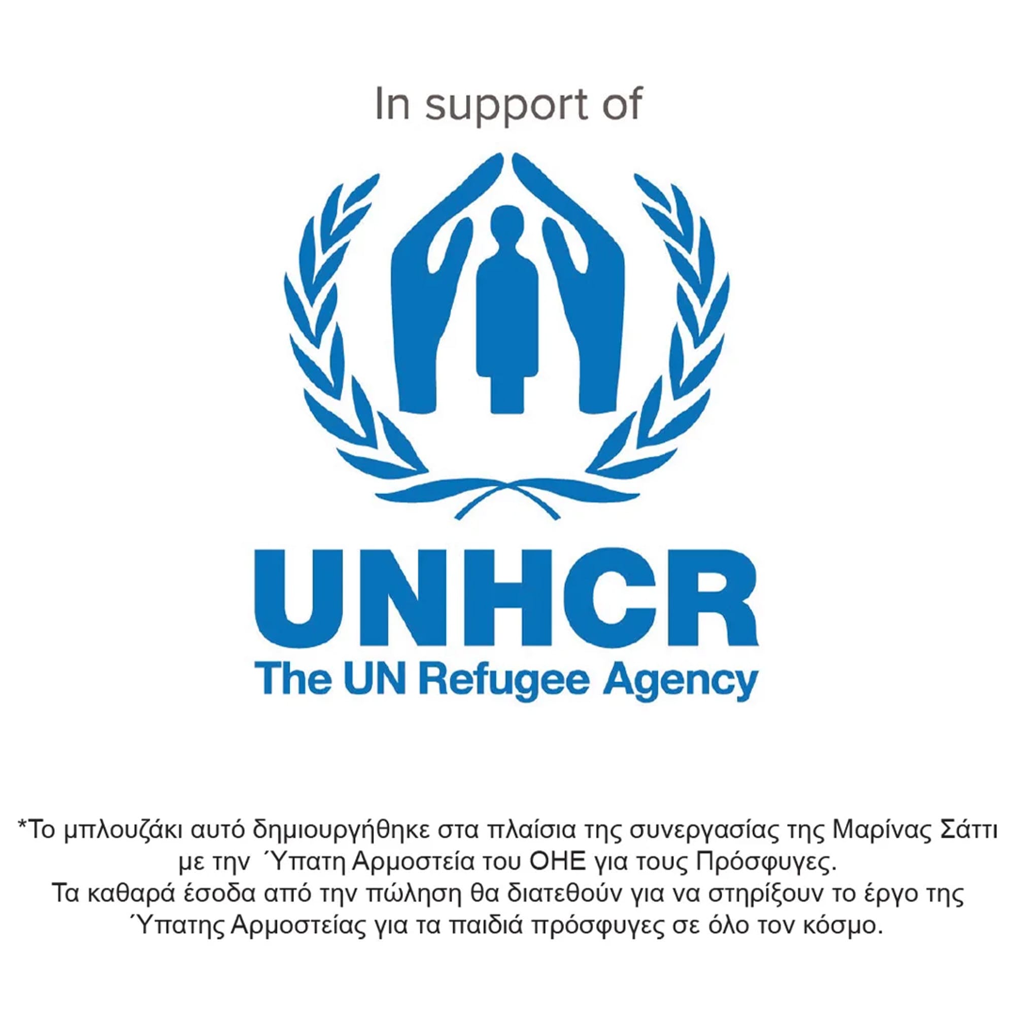 *Το μπλουζάκι αυτό δημιουργήθηκε στα πλαίσια της συνεργασίας της Μαρίνας Σάττι με την Ύπατη Αρμοστεία του ΟΗΕ για τους Πρόσφυγες. Τα καθαρά έσοδα από την πώληση θα διατεθούν για να στηρίξουν το έργο της Ύπατης Αρμοστείας για τα παιδιά πρόσφυγες σε όλο τον κόσμο.